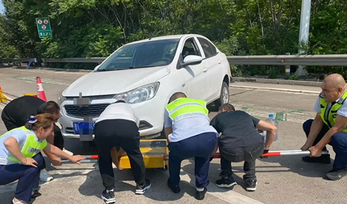 9月21日,在临汾收费站外广场处,一辆白色的小型轿车在即将驶入收费车道时,因驾驶操作失误慌乱中撞倒广场中央防护栏,将车骑到了水泥隔离墩上,导致车辆被卡无法正常行驶。当班收费人员见状,立即赶到事发现场设置警戒线,疏导疏散车辆和围观群众,并查看事故车辆状况,经过集思广益,最后确定采用千斤顶抬高车身缓慢移动水泥隔离墩的救援方案,收费员有的打压千斤顶,有的搬来砖块顶在车体底部,再慢慢移动隔离墩。30分钟后,成功将车辆与水泥墩分离,并帮助司机检查车辆安全状况后,司机安全地驶入高速公路。驶离前司机激动地连声向工作人员道谢,感谢大家在最短时间内帮其摆脱困境。