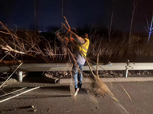 1月20日22时30分,巡查人员韩培明巡查至明曲高速洪洞南枢纽处时,发现广胜寺去往临汾北方向匝道树木倾倒,严重影响道路安全通行。巡查人员及时向值班领导报告后,应急人员第一时间携带电锯、铁锹、扫帚等工具赶赴现场,一边设置警戒区域,提醒过往司乘减速慢行,一边对倾倒树木进行切割,迅速清运搬离现场。经过近1小时的紧急处置,道路隐患成功解除。
