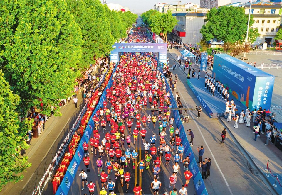 图为5月19日2024年稷山马拉松赛燃情开跑,来自全国各地的4000余名选手在赛道上尽情奔跑、尽享欢乐。