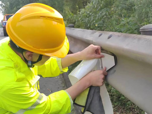 本次创新改造是聚焦于道路两侧和中央分隔带护栏板上的梯形轮廓标由于风吹日晒,材料老化严重,反光效果大打折扣这一问题。创新班组利用现有设备和材料,自制了黄色和白色两种梯形轮廓标贴膜,可以在原有轮廓标的基础上,覆盖受到损耗的反光部分。对破损区域张贴之后,不仅美化了道路环境,降低了材料成本,还重新恢复了道路两侧受到损耗的轮廓标的警示功能,为司机提供了夜间或能见度较低情况下的视线诱导。