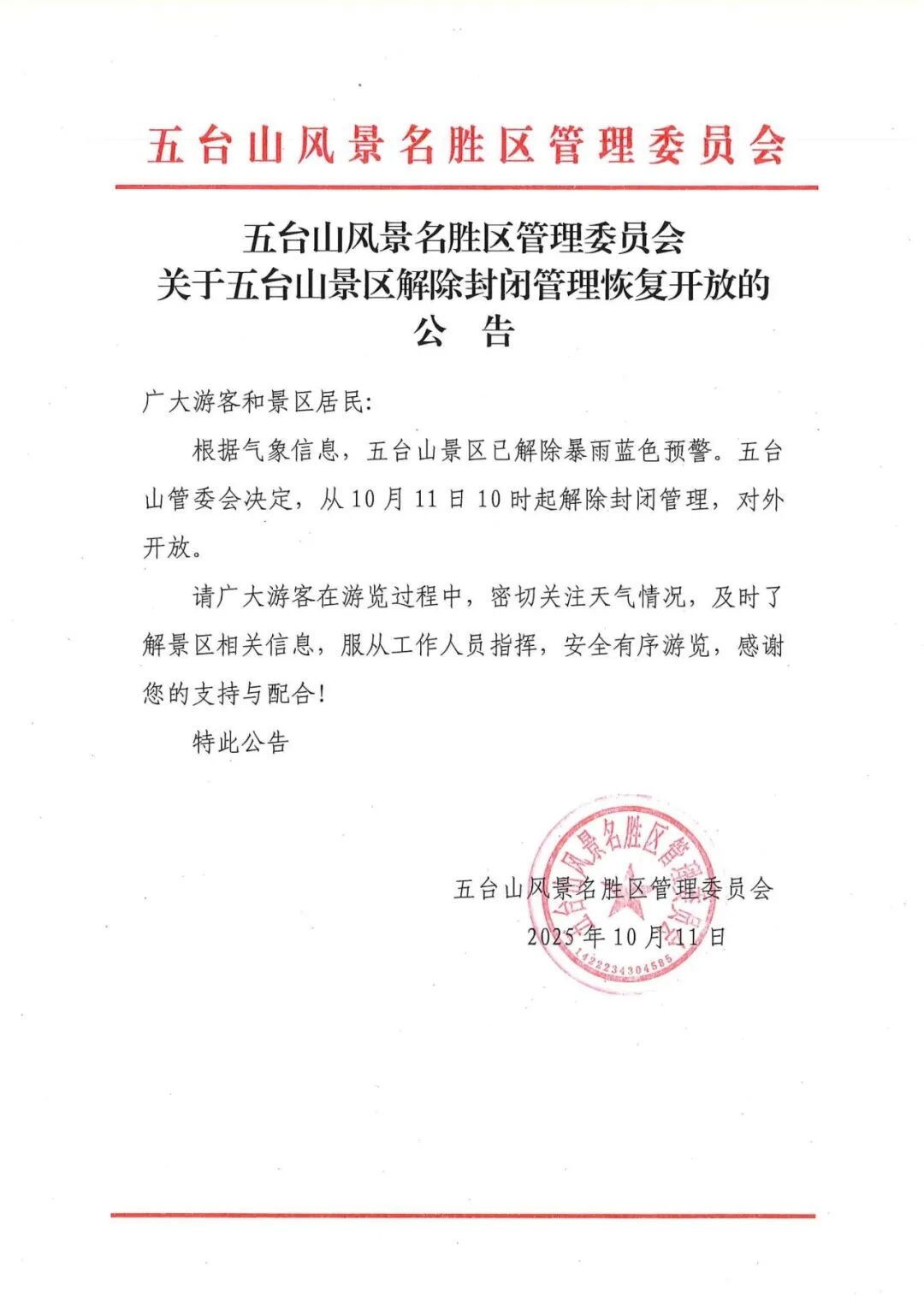 关于五台山景区解除封闭管理恢复开放的公告